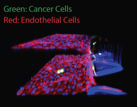 (2)內(nèi)滲:腫瘤細(xì)胞通過內(nèi)滲轉(zhuǎn)移進入循環(huán)系統(tǒng)是癌擴散至關(guān)重要的一步。AIM芯片可以在接近于腫瘤微環(huán)境的情況下創(chuàng)建內(nèi)皮單層,然后就此作為癌癥細(xì)胞內(nèi)滲的模型。